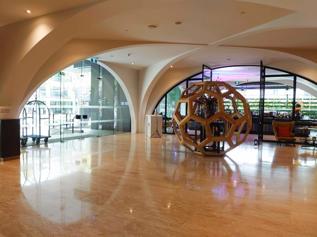 入り口を入るとすぐ目の前に木枠の球体のオブジェがお出迎え。