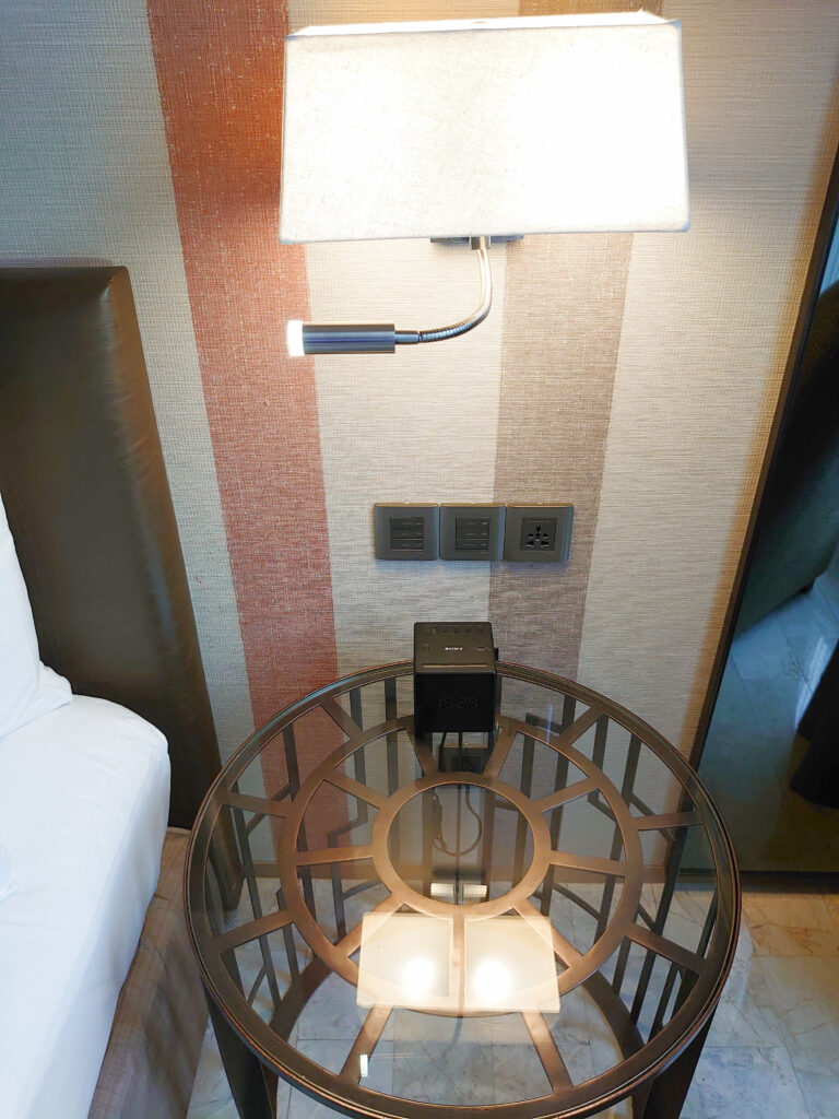 反対側のベッドサイドにはガラステーブル、スピーカー、ベッドサイドランプ、読書灯