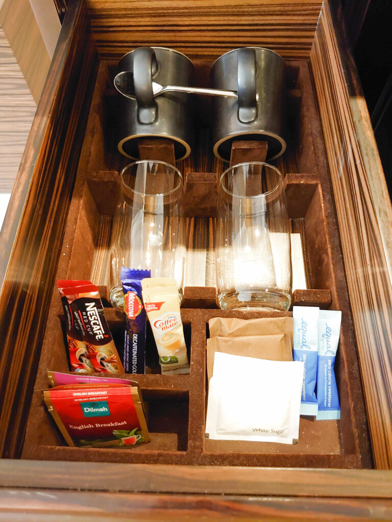 引き出しにはインスタントコーヒー、紅茶パック、コーヒーカップ2つ、グラス2つ