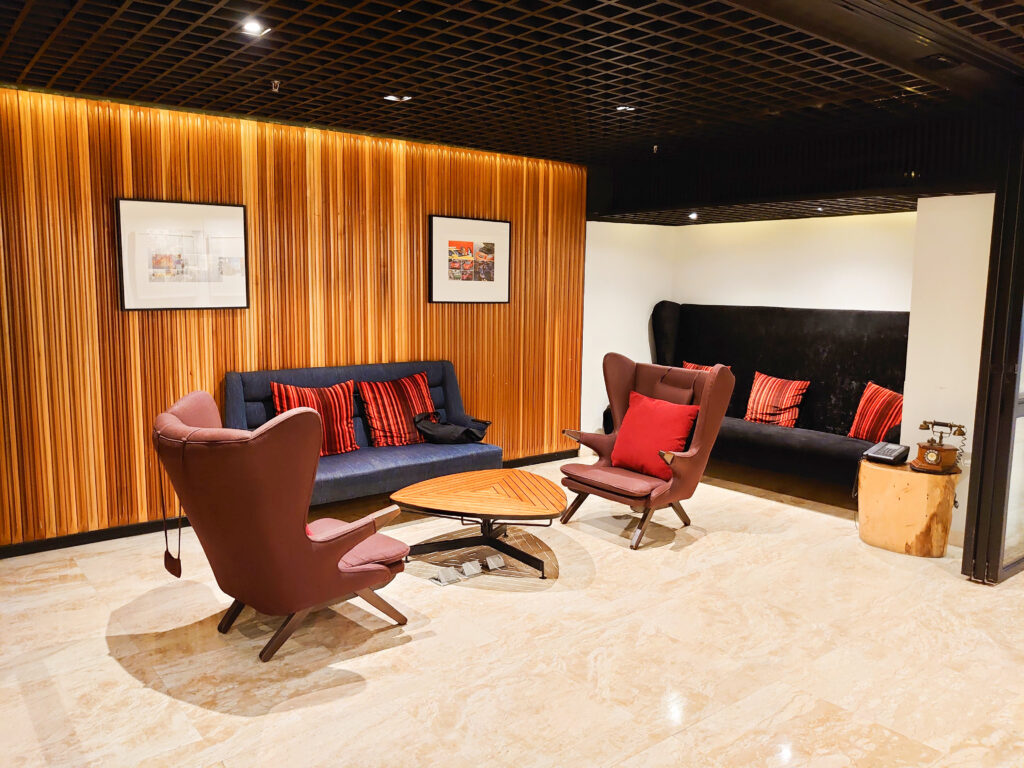 フロントのある1階にはゆったり寛げるソファー等があります。右側がレストラン(朝食会場)です。