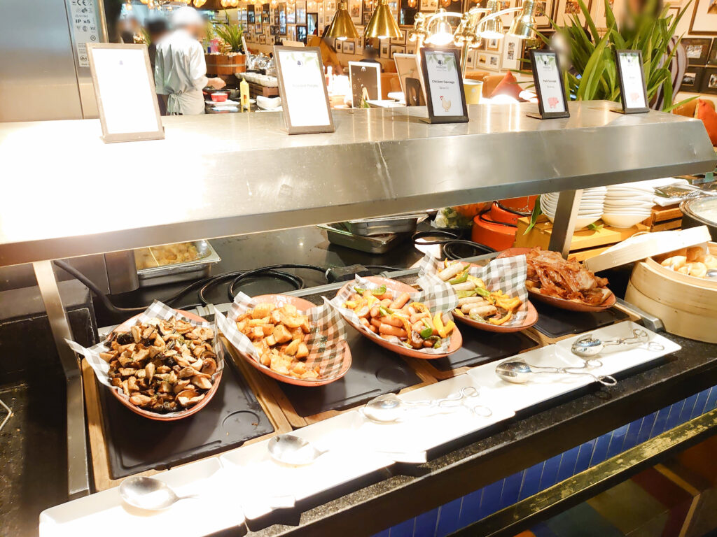 マッシュルームポテト炒め、ローストポテト、チキンソーセージ、ポークソーセージ、ベーコン