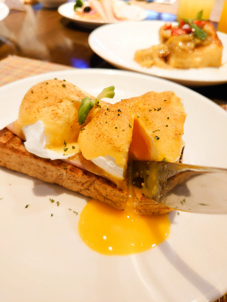 ナイフを入れると、半熟卵の黄身があふれ出てきます