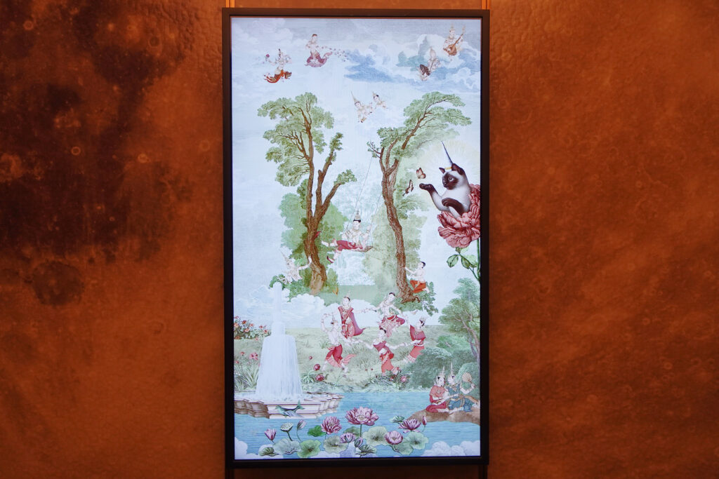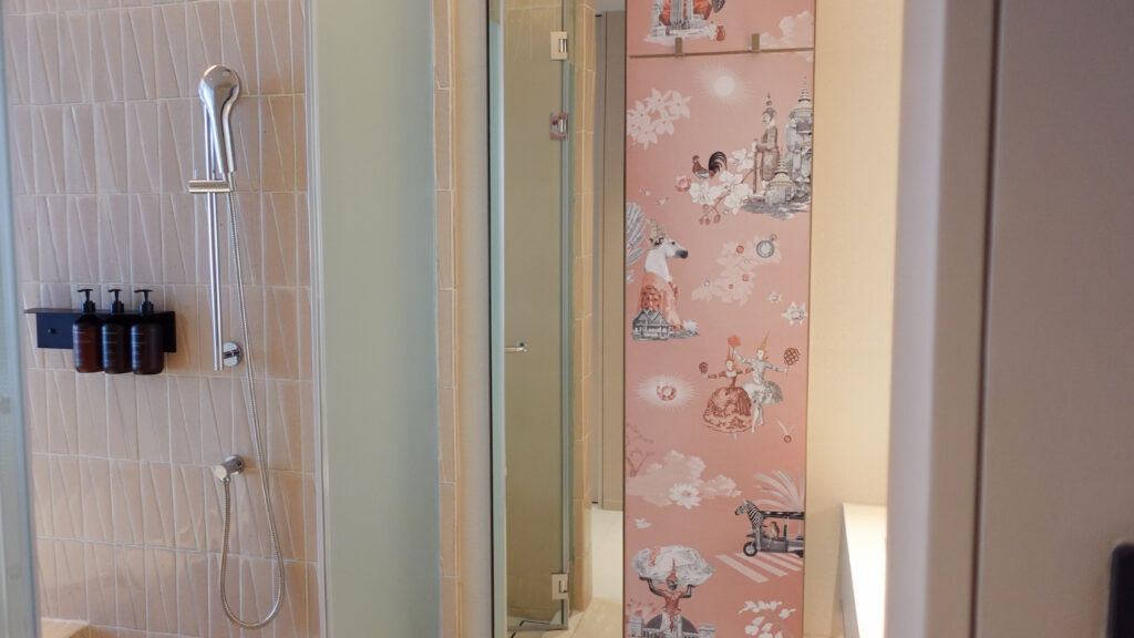 ピンク色ベースのお洒落なタイ風のアクセントクロスが目に入ります