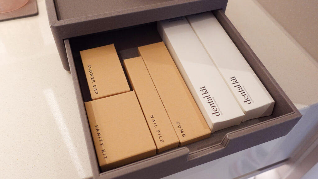 アメニティ一式(シャワーキャップ、バニティキット、ネイルファイル、コーム、歯ブラシ2つ)