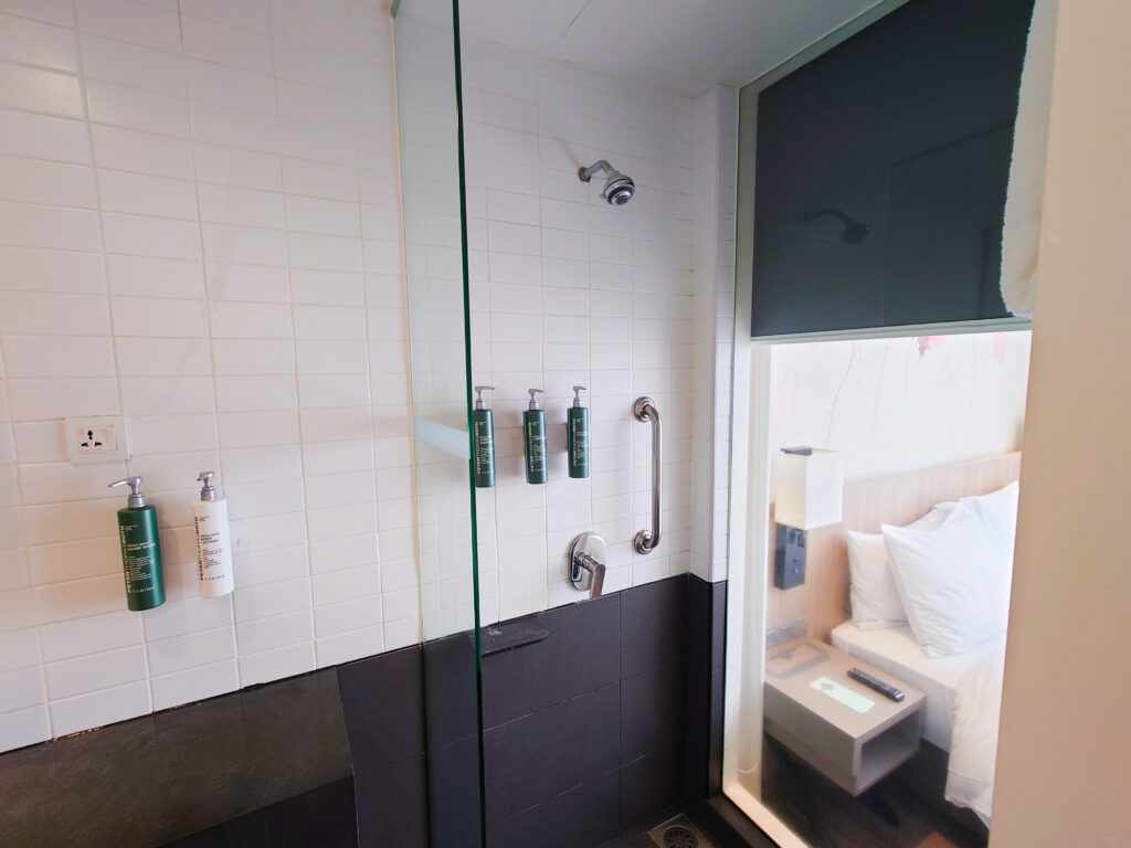 右側がシャワールーム、ガラスで少しだけ仕切りがあります