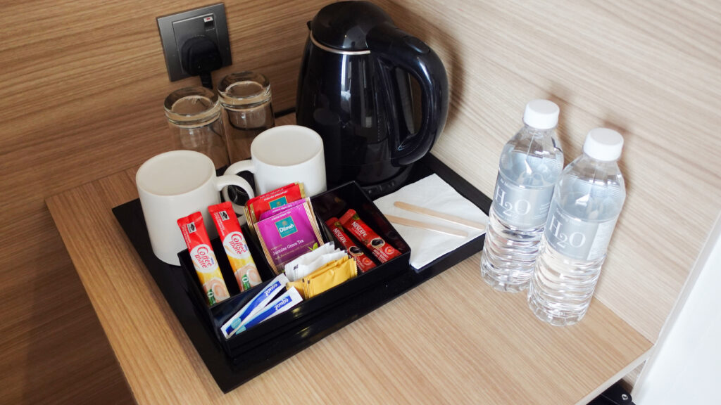 インスタントコーヒー、紅茶パック、ミネラルウォーター2本