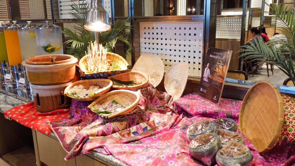 マレーシアの布や網籠等で飾られたコーナー