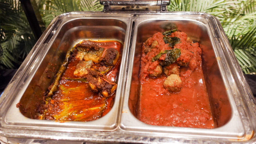 サンバルの焼き魚、バジルとトマトのミートボール