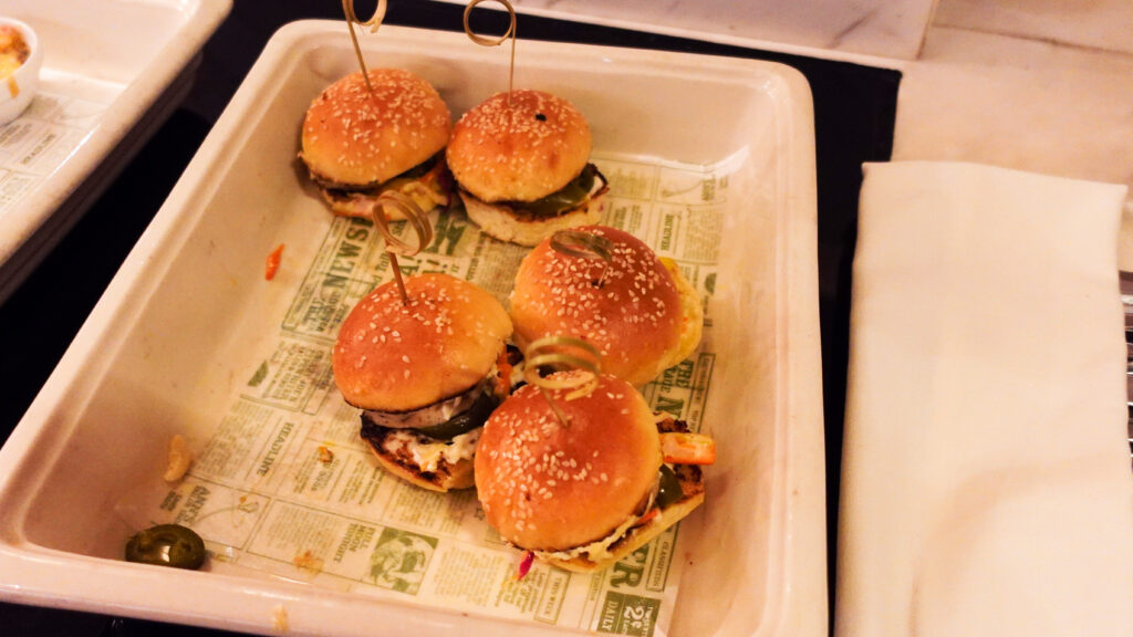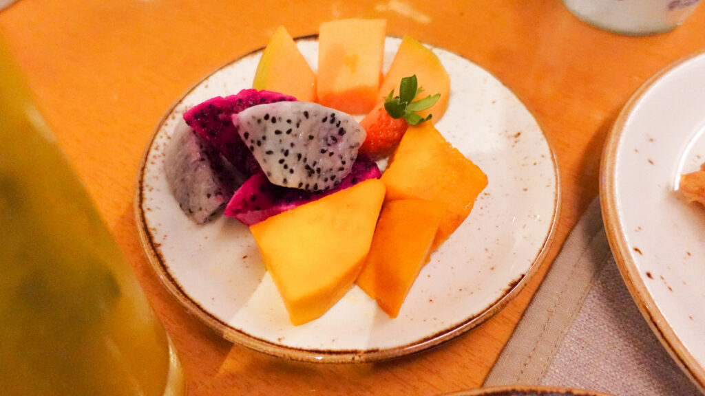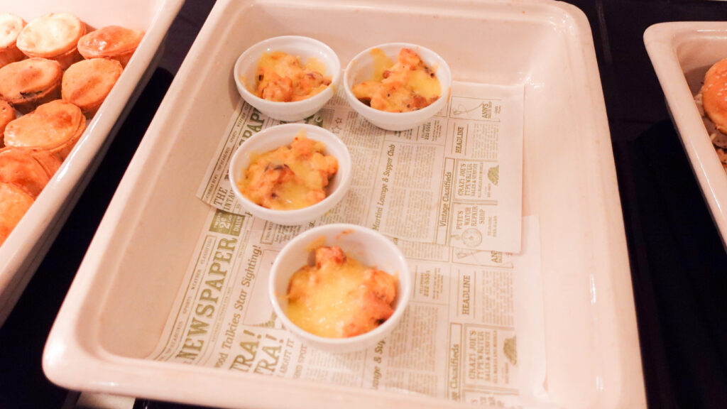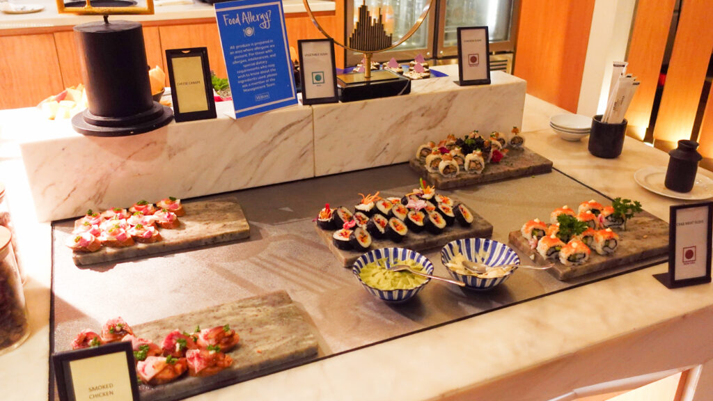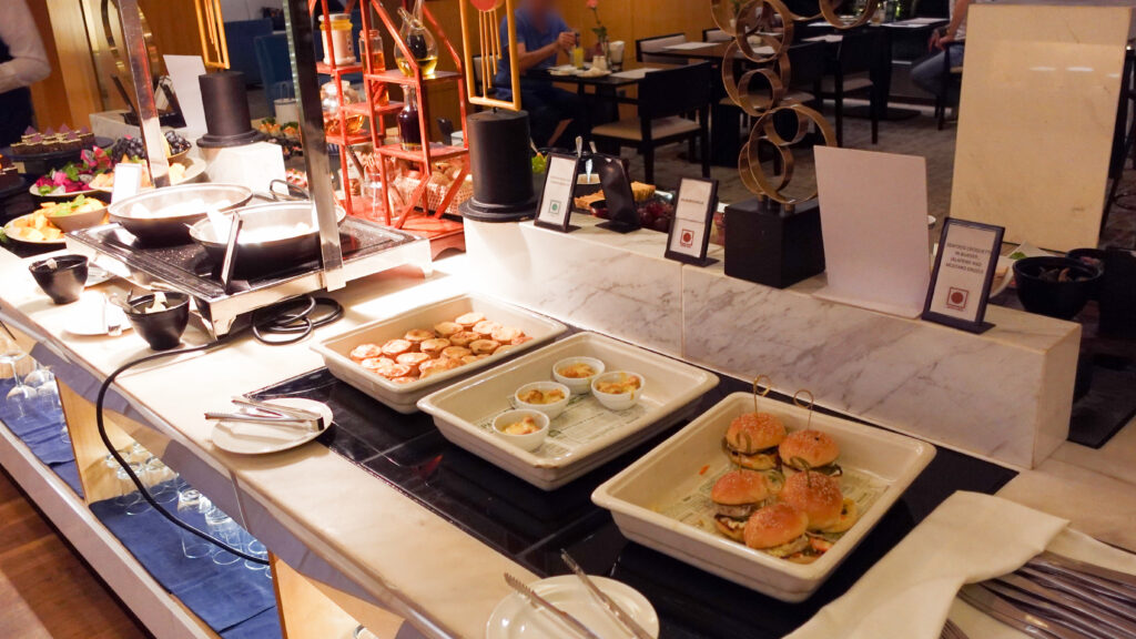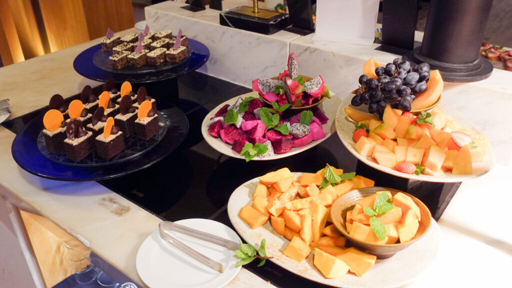 カクテルタイムは料理の品数は十分で、ホットミールは手の込んだお料理が並び、他にもコールドミール、カットフルーツやデザートと一通り揃っており、補充もテキパキされていました。満足出来るレベルだと思います。