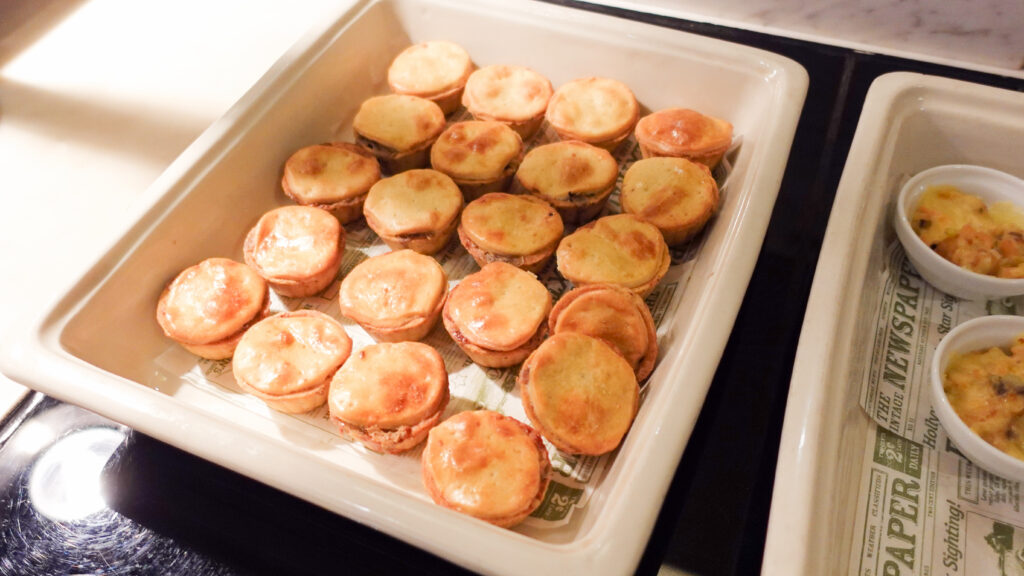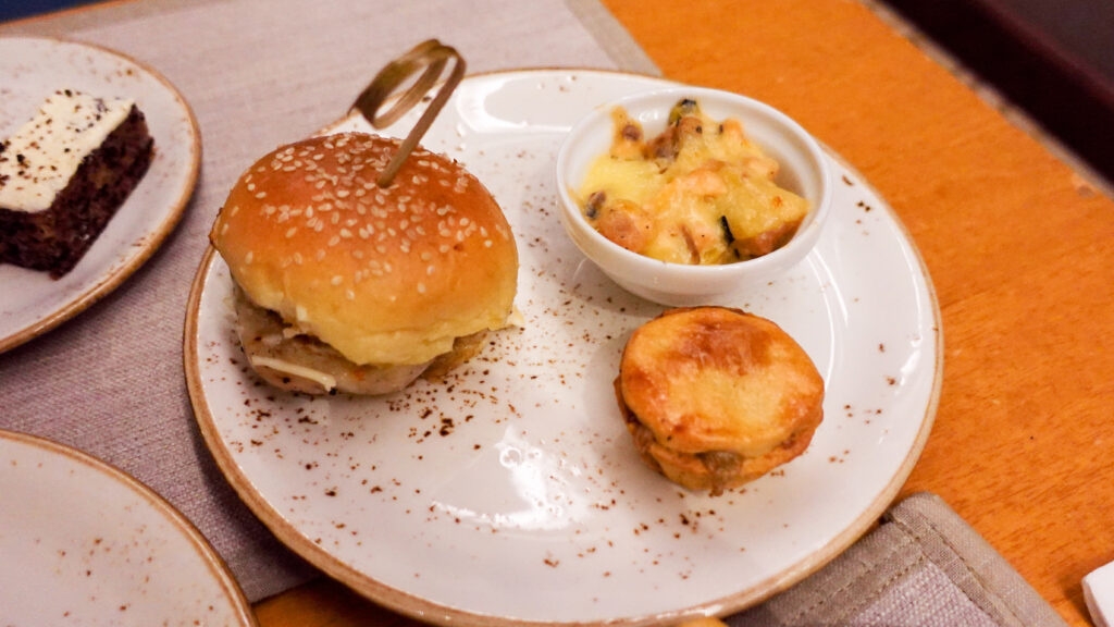 シーフードコロッケバーガー、鮭のデュクセル、エンドウ豆とシャンピニオンのパイ