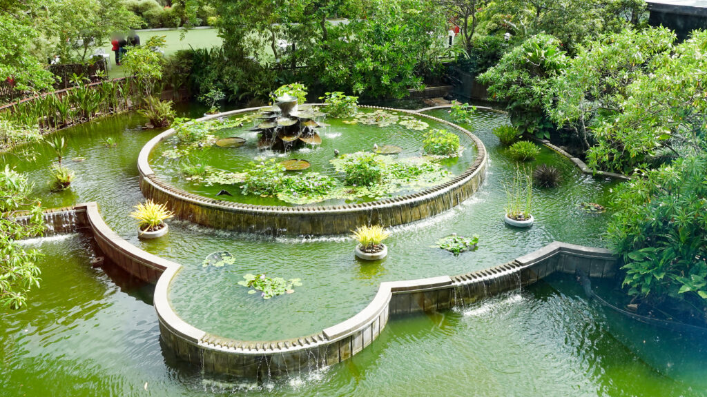 窓の外には中庭と池が見えます