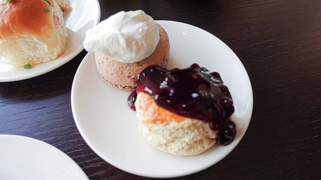 スコーンにはクロテッドクリーム、ブルーベリージャムをトッピング