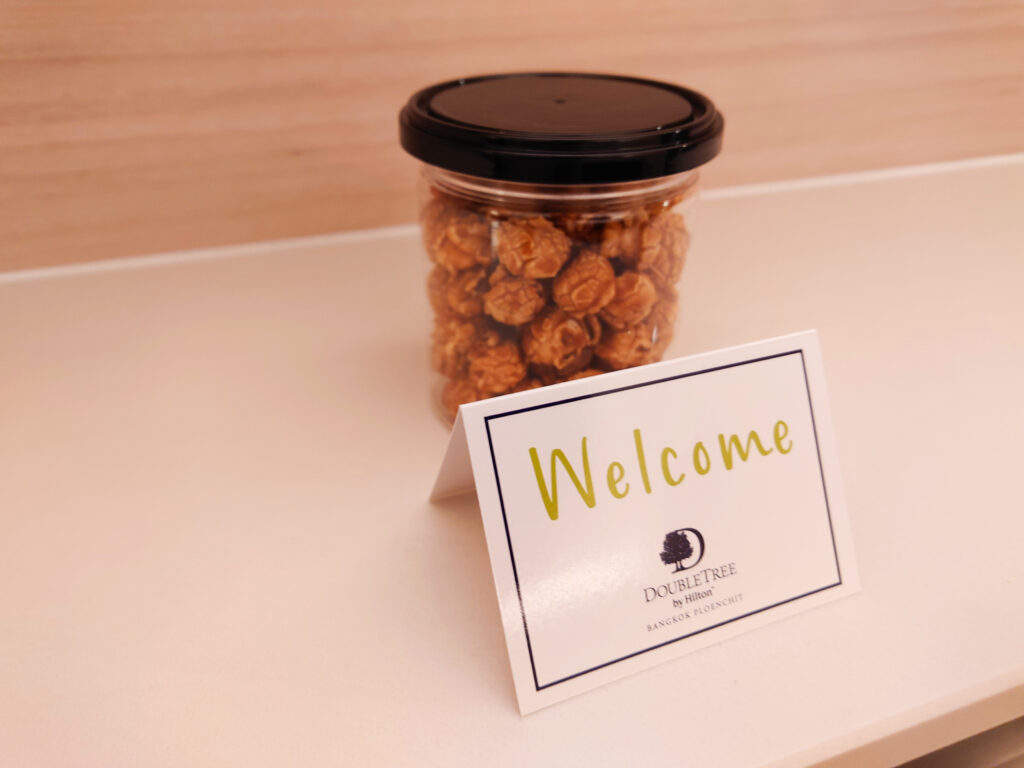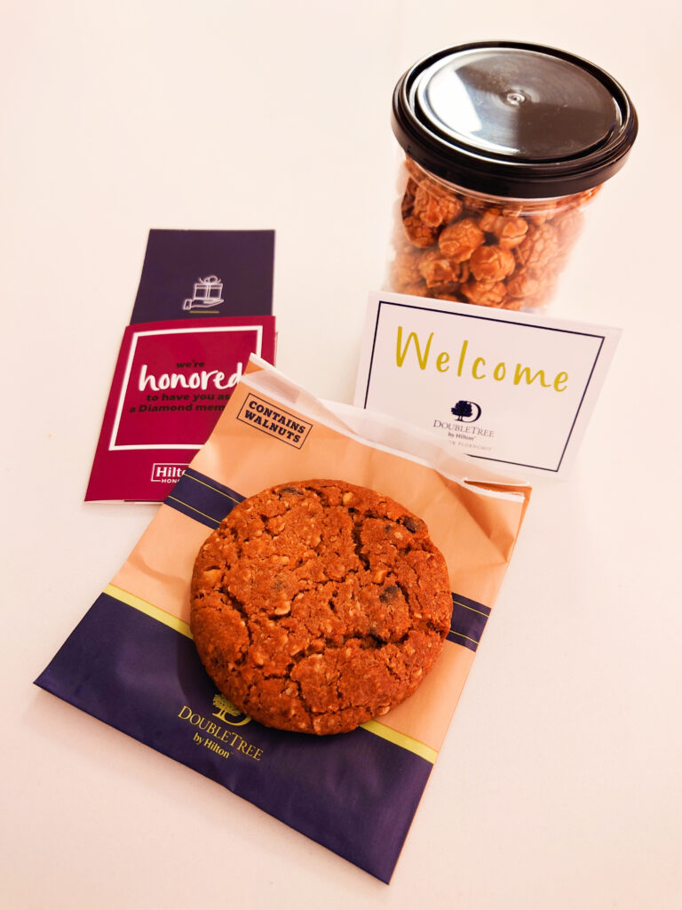 フロントでチェックイン時に頂けるダブルツリー特製チョコチップクッキーはいつも熱々、